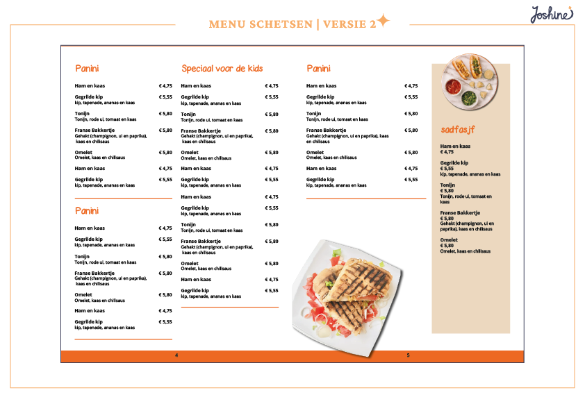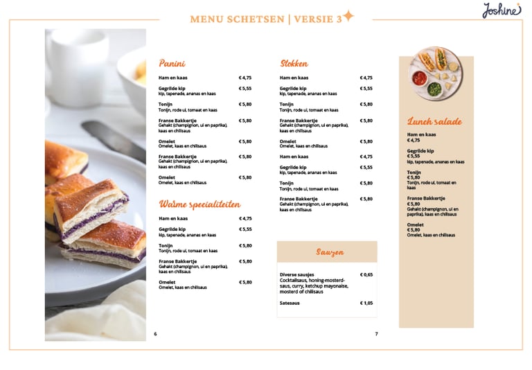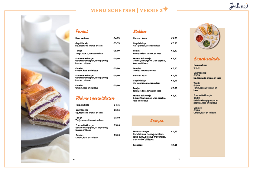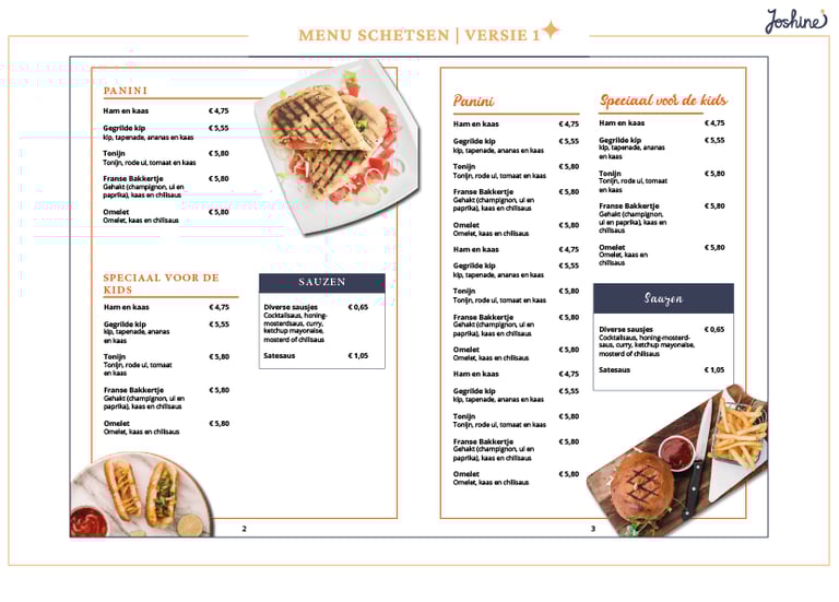 Er zijn verschillende ontwerpen voor de menukaart gemaakt en deze zijn besproken met de client. Uiteindelijk heeft de client besloten om geen afbeeldingen te gebruiken. Het resultaat hiervan is hieronder te zien.