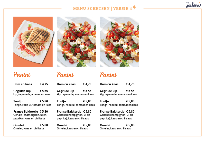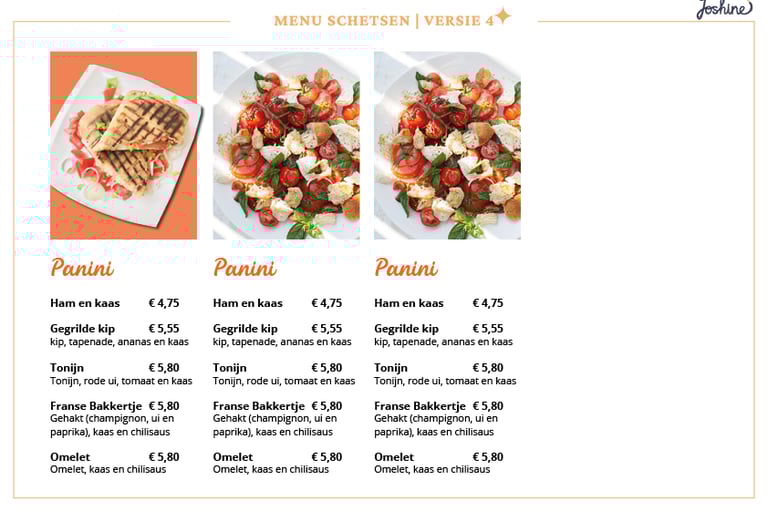 Ik heb verschillende versies ontworpen. De stockfoto's zijn afkomstig van internet. Het idee was om een sfeerimpressie te creëren, zodat de client alvast een idee kon krijgen welke foto's er gebruikt zouden kunnen worden en hoe de menukaart eruit zou kunnen zien.