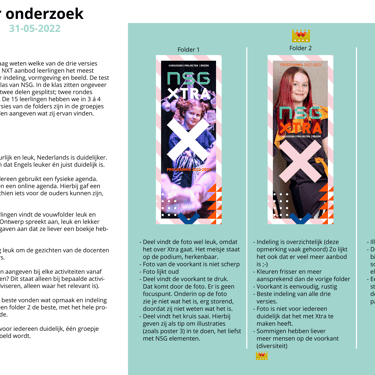 Met de NSG XTRA folder kunnen leerlingen het aanbod van verschillende activiteiten bekijken en zich vervolgens aanmelden voor de activiteit van hun keuze. Samen met mijn collega heb ik de folder ontworpen in de stijl van NSG. Om te achterhalen of de doelgroep het ontwerp interessant en passend vindt, heb ik de doelgroep betrokken bij het ontwerpproces. Dit heb ik gedaan door middel van A/B testing, waarbij ik verschillende versies aan de doelgroep heb voorgelegd en getest. Met de resultaten van het testen heb ik een infographic gemaakt, waarmee je gemakkelijk de resultaten kunt bekijken.